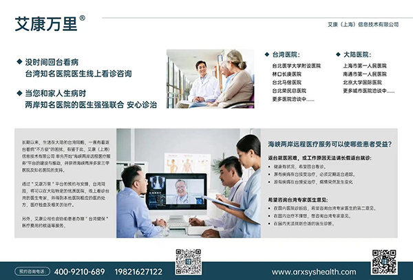 台湾同胞只要加入“艾康万里”会员,即可通过"艾康万里"平台的预约与安排,将可以在大陆特约的优质医院,线上看诊台湾的医生或专家,并得到本地医院相应的医药处方,医疗检查,相关的治疗及绿色通道等医疗服务。